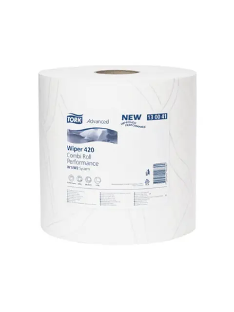 Priemyselný papier TORK Advanced Wiper 420, pre systém W1 a W2,kód: 130041, 2 vrstvy, TAD+recykl. biela, rozmer útržku: 23,5x34cm, dĺžka: 255m, priemer kotúča 26,2cm, počet útržkov: 750 . Balené po 2 kotúče.